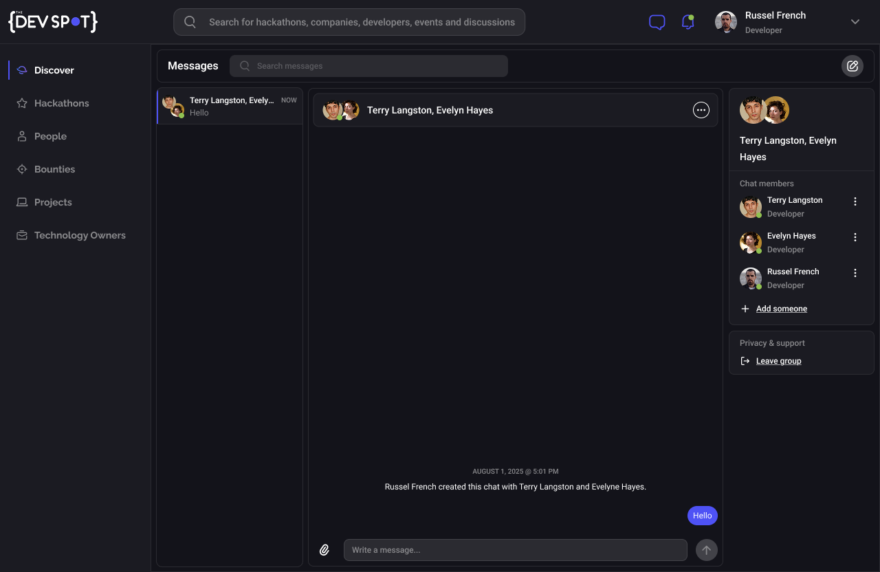 Goal: Enable seamless team communication within the DevSpot platform.